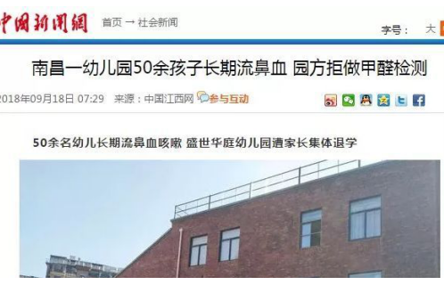 據(jù)中國新聞網(wǎng)報道, 9月17日,剛剛開學不久,由香港YM教育集團投資創(chuàng)辦的南昌經開區(qū)奧克斯盛世華庭幼兒園遭到家長集體退學。家長們告訴記者,該幼兒園園開學一年來,已有50名幼兒頻繁流鼻血、咳嗽。家長們都懷疑是學校甲醛超標引起的,但是園方卻拒不配合檢測,且處理態(tài)度十分惡劣。出于對孩子健康的擔憂,幾十名家長不得不讓孩子退學。